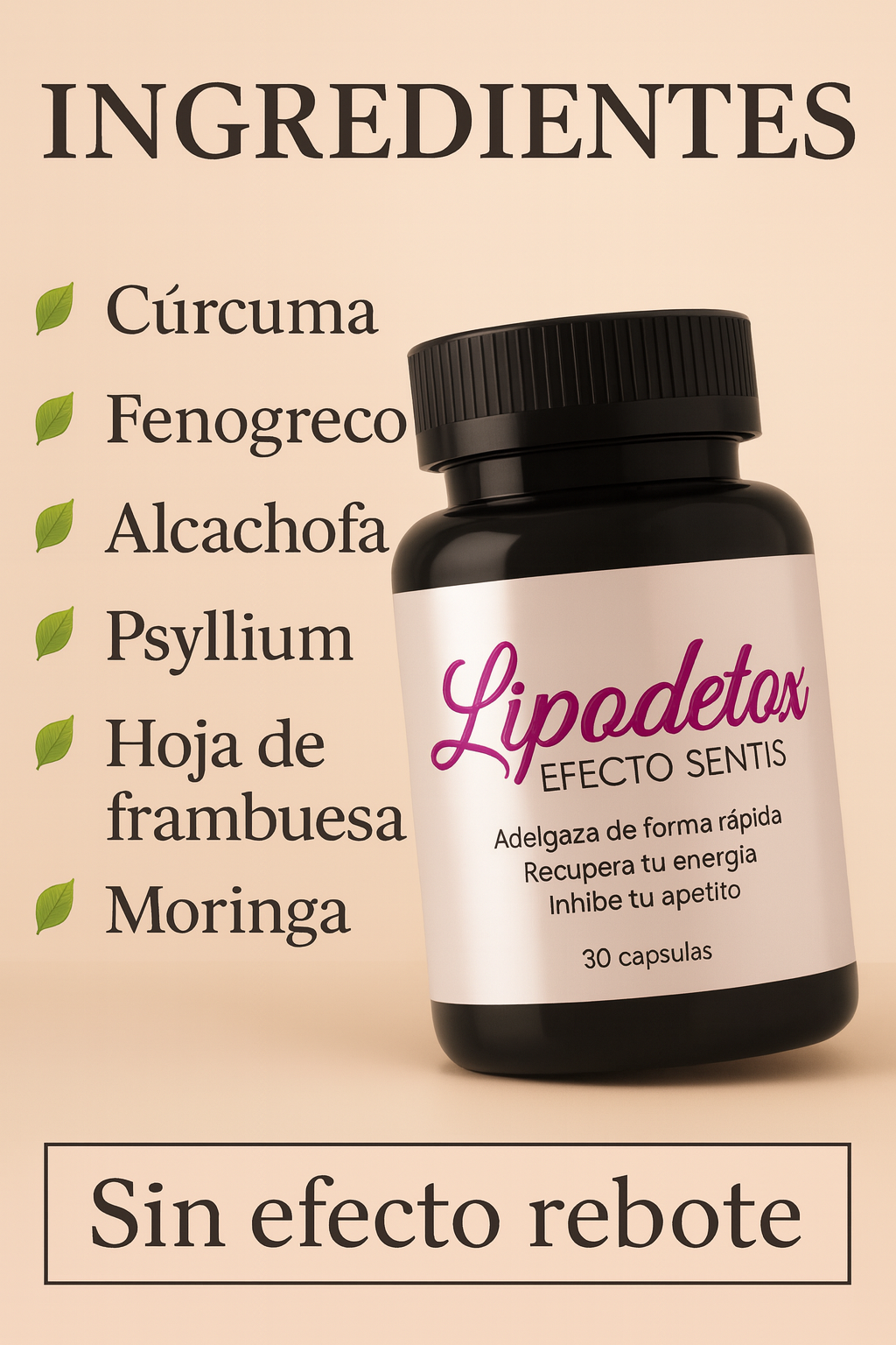 Son cápsulas suaves para el organismo, no generan taquicardia ni malestar; el único efecto común es aumento leve de la sed, por lo que se recomienda beber más agua. Con uso constante, muchas personas notan cambios en un mes.